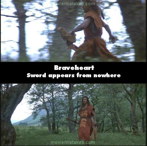 Continuity mistake: When Wallace tries to escape from the English with his wife, not knowing that she has been captured and executed, he is seen running through the woods screaming her name... As he's running he has a sword in his right hand. During the course of three or four camera shots, the sword he is holding magically disappears and reappears as different cameras shoot him. Then it reappears and he digs it into the ground as he takes off the English soldier's uniform that he stole. (00:42:35)
