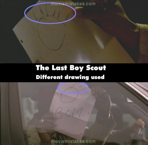 Continuity mistake: When Wayans and Willis are chasing the limo on the freeway, Wayans draws a picture of a bomb to hold up to the guys in the limo. He draws a large circle with about 6 lines coming out of it with the word "BOM" underneath it. When he holds the picture up at the window, there is only 1 line radiating from the circle. (01:20:40)