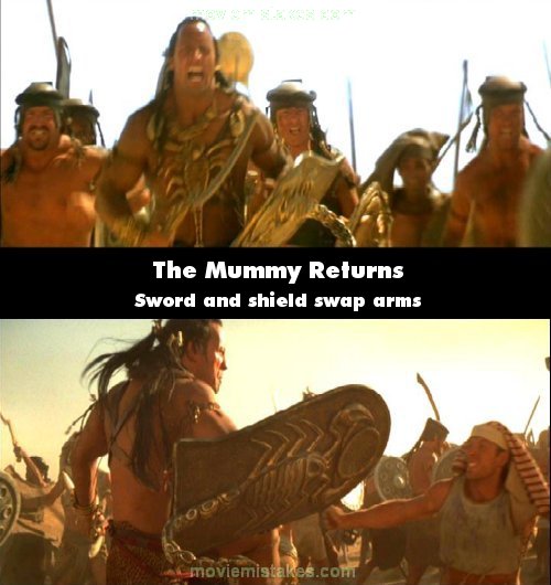 Continuity mistake: During the first battle, the Scorpion King is fighting with his sword in his right hand and his shield in the left. For one instant, they change arms. I assume the film must have been reversed. (00:01:46)