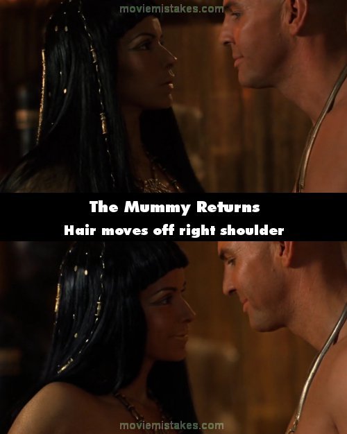 Continuity mistake: When Patricia Velasquez has her first flashback to her past life, she is in a room with Imhotep. If you look closely at her shoulders in an up close shot, her hair is in front of both of them. Then we cut to a shot of the room from outside (we can see the room through the balcony) and the hair is still over both shoulders. Then we cut to another up close shot of Patricia, and we see that her hair is over her left shoulder, but behind her right one. (00:49:15)