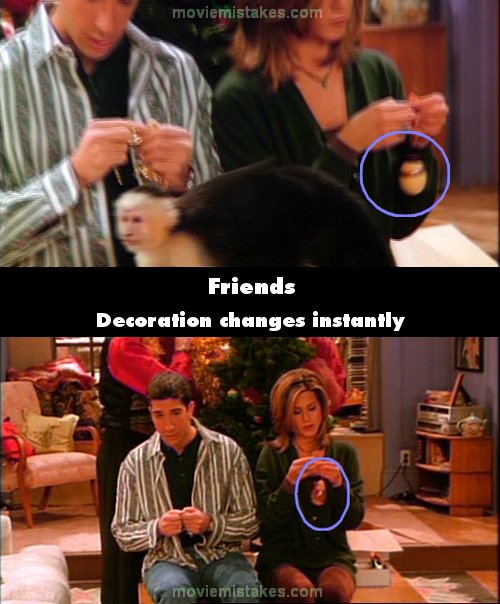 Continuity mistake: When Rachel says about her 6th date with Paulo, she is holding a decoration for the tree. In the next shot the decoration changes to a much larger object. Then, in the next shot, as she hands it to Monica, it has turned back to the original shape. (00:05:40)