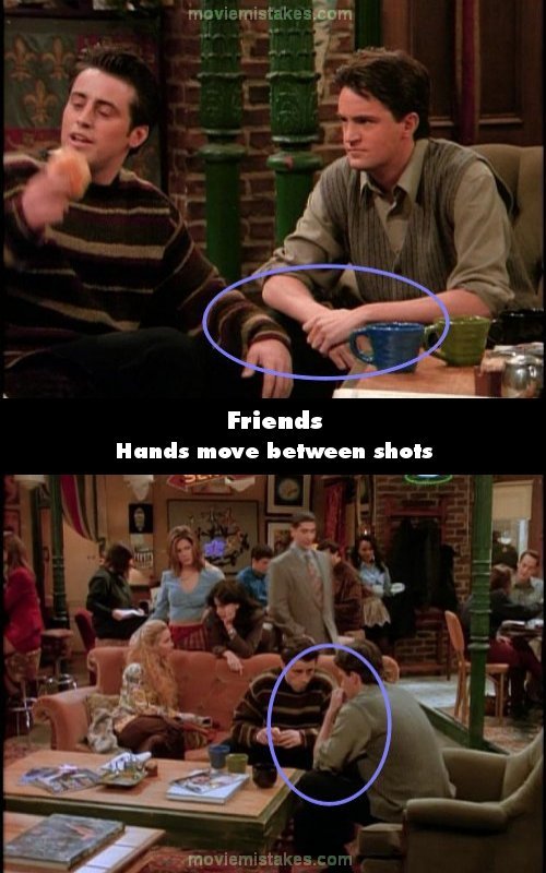Continuity mistake: Just after Rachel throws a bread roll at Joey, he turns to Chandler to speak to him. Chandler is holding his hands out in front of him. In the next shot, his right hand is touching his face, then in the next shot, it is lowered again. (00:02:55)
