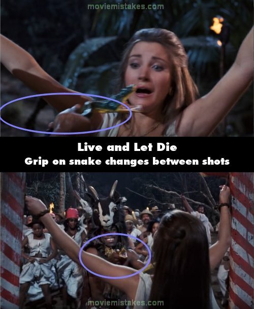 Continuity mistake: When approaching Solitaire, the voodoo priest's grip on the snake changes between shots. (01:44:15)