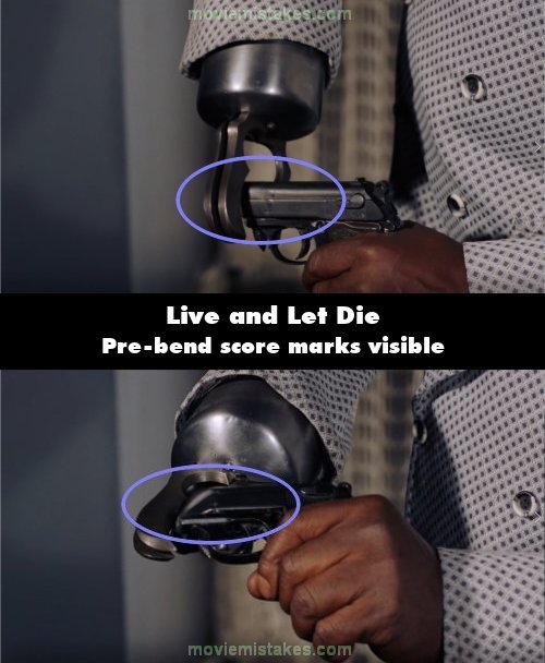 Revealing mistake: When Tee Hee bends the barrel of Bond's Walther PPK, in the close-up, the score marks where the barrel has been pre-cut are visible. (00:24:50)