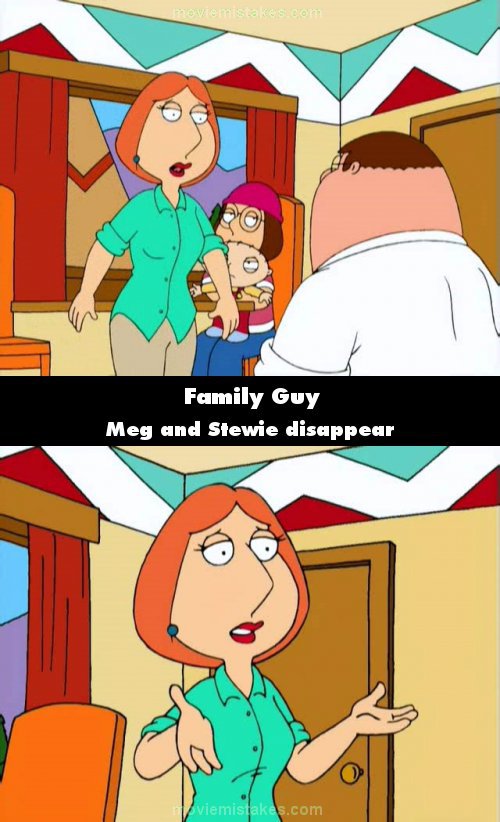 Continuity mistake: When Lois is saying "I feel so foolish, it seemed like such a good cause", Meg and Stewie disappear from the chair she was sitting on. (00:13:25)