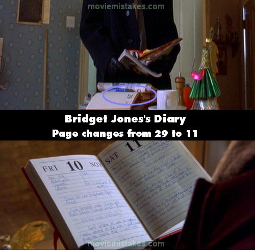 Continuity mistake: Towards the end when Mark Darcy finds her diary, you clearly see the number 29 as he pulls it from under the magazines, then when you see the diary it's open on pages 10 and 11.