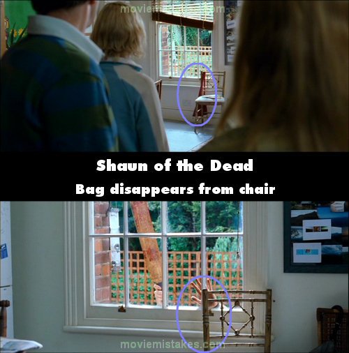 Continuity mistake: When Shaun climbs up to Liz's apartment, there is a large handbag that hangs on the back of chair beside the window, but it is gone in the next close-up. (00:48:50)