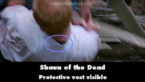 Revealing mistake: When Shaun tackles the blue robe zombie they both slam through the wood fence. The thick black protective vest that Shaun wears is very noticeable under his shirt and is actually visible below his shirt collar. (00:58:10)