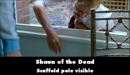 Visible crew/equipment: When Shaun scales up the side of the building to Liz's apartment the second time, just as he places the cricket mallet on the floor and begins to climb through the window, the steel tubing for the scaffold platform is visible just to his right. (00:49:00)