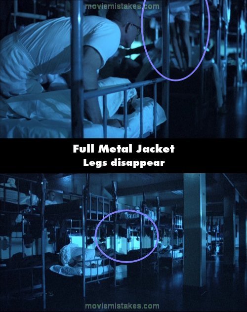 Continuity mistake: As the men get out of bed to attack Pyle, a close-up of Cowboy shows him looking to Snowball. Both are in bottom bunks. Between them we see a pair of legs lower and hang from a top bunk. The shot changes to a more distant angle and the legs repeat the motion. (00:28:50)