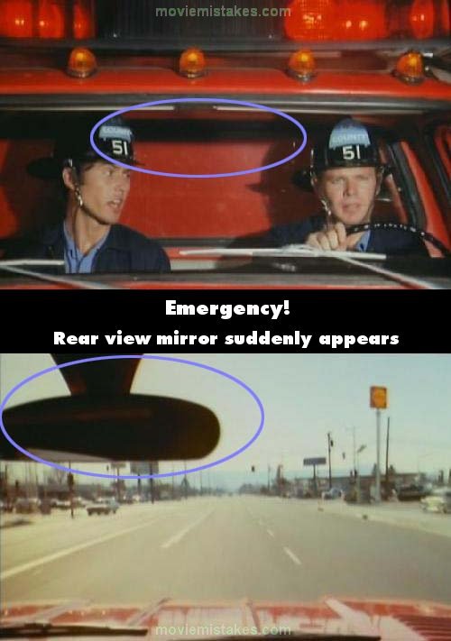 Continuity mistake: In many of the interior shots of the paramedic cab, as it heads to the destinations, there is a rear view mirror on the windshield. In all the exterior shots there is no rear view mirror.