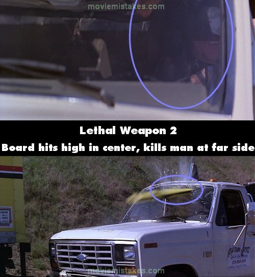 Plot hole: The hitman in the tow truck leans into the rear/left corner of the cab as the surfboard approaches. The board hits the glass at the very top, dead center. Hence, it definitely misses him completely, yet the hitman is killed. Windshields don't break into "shards" (which is another mistake made listed here, and as it can't exist, it can't be the cause of death) and the roof is not damaged. He is the driver, and he stops the truck by braking. There is no vehicle collision. It is clear to all viewers that the makers intended the surfboard to be the cause of death - nobody watching the film thought otherwise.