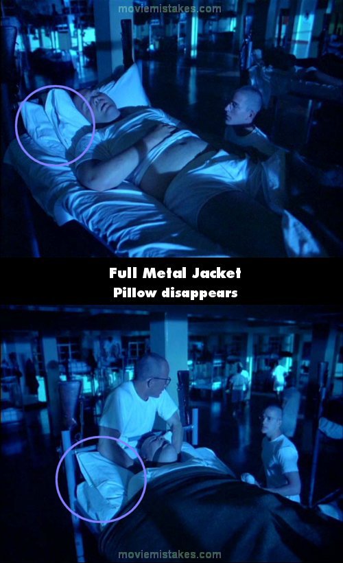 Continuity mistake: During the "blanket party" scene, Pyle appears to be sleeping on two (wrinkled) pillows. When Cowboy covers his mouth Pyle is sleeping on one very neat pillow. (00:28:39)