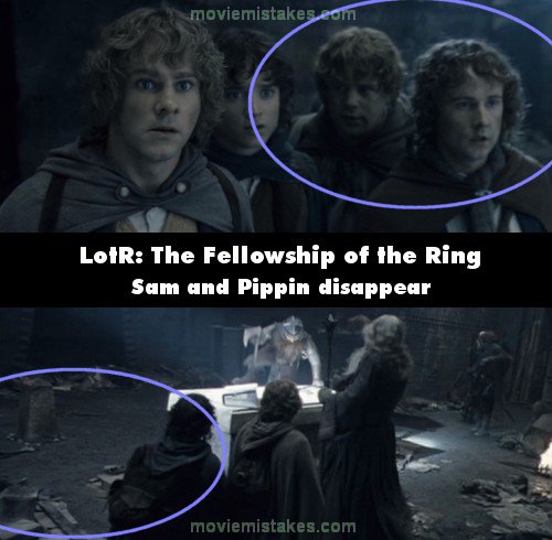 Continuity mistake: In Balin's tomb, just before the Orcs break in and the fight begins, watch the Hobbits behind Gandalf. In the front view, they are huddled together in close proximity. When the shot changes to the rear view, you can only see two Hobbits (Pippin and Sam) behind Gandalf because they are much more spaced out. When the camera comes back to the front view, they are close together again. (00:27:24)