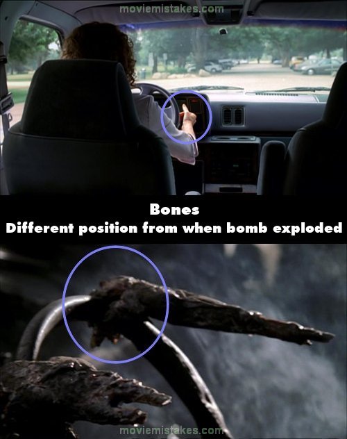 Continuity mistake: In the opening scene the victim's right hand is by the car shifter when the bomb explodes, but when Booth and Brennan first get to the van, the right hand is melted onto the steering wheel. (00:00:50 - 00:01:35)