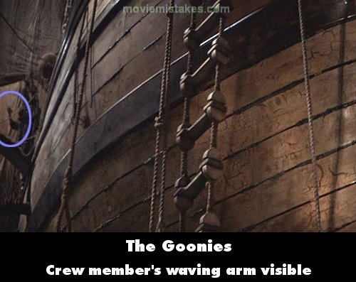 Visible crew/equipment: When the Goonies are first climbing the ladder on the pirate ship to find one eyed Willy's gold, the second shot has a crew member waving his arm on the far left of the screen. (This is only visible in the widescreen version). (01:21:00)