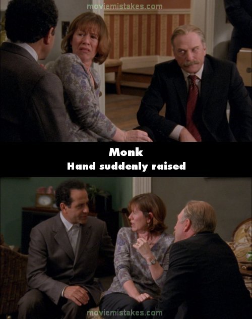 Continuity mistake: When the victim's niece is crying and Monk is quizzing her about the house, the position of her hands changes instantly several times as the camera reverses angles. She holds her hands to her face as she cries, for instance, but in the very next shot, her hands are down at her sides. Next cut, they're up to her face again. (00:09:00)