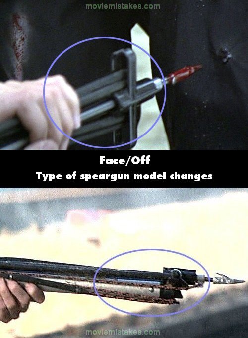 Continuity mistake: When Sean (as Castor Troy) stabs Castor (as Sean Archer) in the leg, the type of speargun actually changes between shots, it is an entirely different model. The spear tip differs as well.