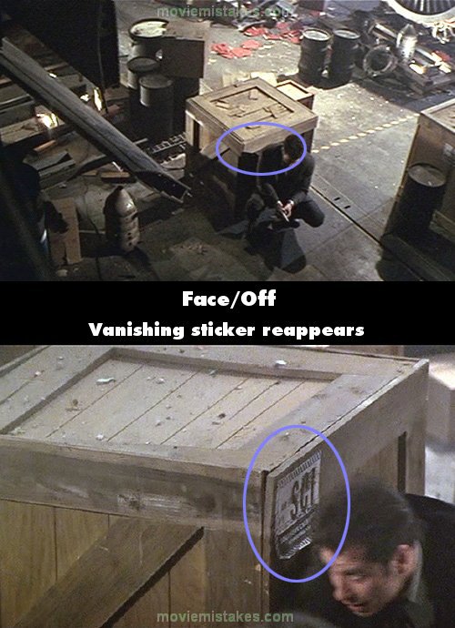 Continuity mistake: At the airport hangar, after Castor reloads, in the close-up Sean is kneeling beside a crate with a large black/white SCI air freight sticker. In the overhead shot, when Castor Troy aims the gun at Sean, the sticker is gone. Debris also disappears. (00:15:35)