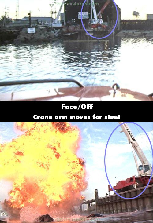 Revealing mistake: Just as the red speedboat heads toward shore, before it crashes, the white and red truck cranes are on the dock and the white crane arm is angled backwards over the dock. In the shot facing the speedboat, as it explodes, that crane arm is now angled the opposite way, over the water, since it was used in the stunt.