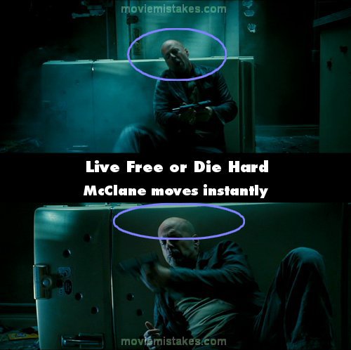 Continuity mistake: When McClane knocks the fridge over so it's on its side near the start, his head is above the top (side) of the fridge. Camera cuts and it is well below the top (side) of the fridge. (00:12:45)