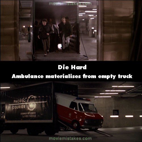 Continuity mistake: When the terrorists enter the building, they stream out of the rental truck. You don't see the large ambulance that emerges for their getaway at the end of the film. This is because the ambulance was a late addition to the script - the terrorists leaving the truck was originally a longer shot, but had to be cut down as short as possible to hide the lack of ambulance. More info in the trivia section. (00:18:00)