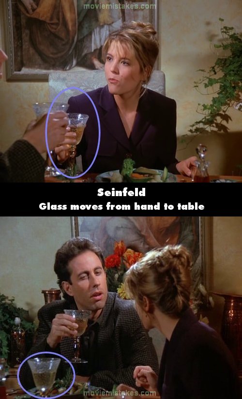 Continuity mistake: At the start of the episode, Cynthia is drinking a glass of wine. While speaking near the end of the scene, she is holding the glass in her right hand and says, "You know, guides you in your career path." The next shot is of Jerry and instantly the glass has disappeared from her hand with her right hand resting on the table. You can also see the glass is closer to her left hand now.