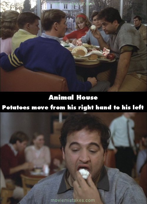 Continuity mistake: In the cafeteria "I'm a zit" scene, Bluto picks up the mashed potatoes with his right hand, but the very next shot shows him placing it in his mouth with his left hand. (00:34:50)