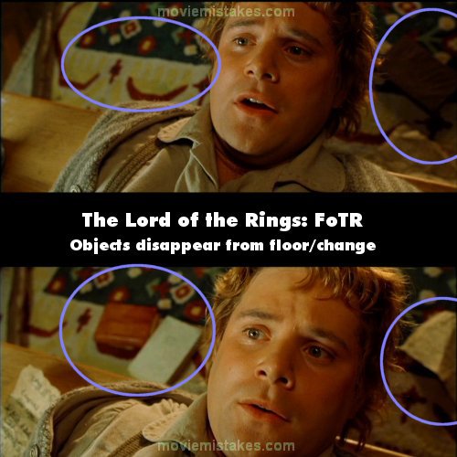Continuity mistake: When Gandalf pulls Sam in through the window at Bag End and throws him on the desk to ask him questions, several items fall off of the desk. The scene switches back and forth between Sam and Gandalf's perspectives several times. When Sam is shown, the arrangement and appearance of items on the floor below vary. In some shots there is a wooden box and book on the floor to the left side of Sam's head and/or a book and paper to the right. (00:40:50)
