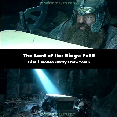 Continuity mistake: When Gimli falls onto his knees in front of Balin's Tomb in Moria, in one shot he's a few feet in front of it, in the next he is so close to it, that he could lay his head onto the tomb. In the following shot Gimli is further away again, so he should not have been able to reach it with his head. (00:24:20)