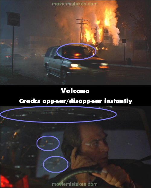 Continuity mistake: Roark's car has the windscreen smashed and cracked by the volcanic ash. In some shots, mainly a distant shot of it being driven, there are no cracks in the windscreen. (00:32:35)