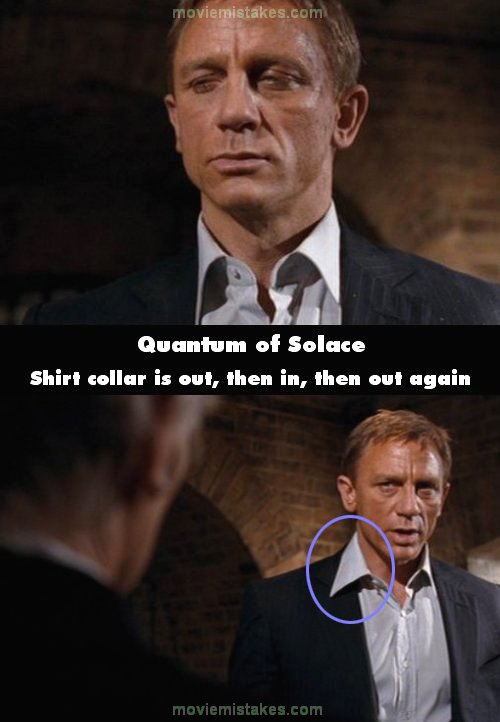 Continuity mistake: When Bond is talking to M, his shirt collar is out of the blazer, then back in, then out again; all in a space of 30 seconds. (00:08:40)