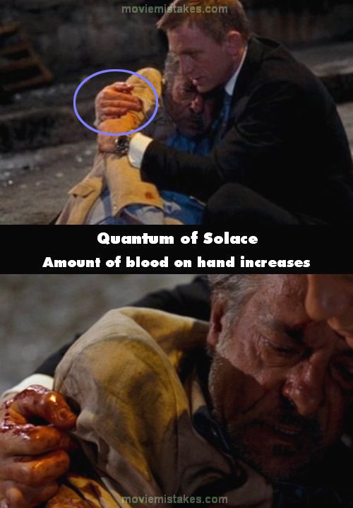 Continuity mistake: As Bond is cradling Mathis after Mathis gets shot by the policemen, the blood on Bond's right hand changes between the long shots and the close ups. (01:03:10)