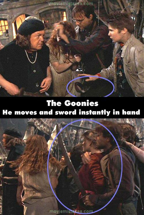Continuity mistake: On the Inferno's deck, after Mouth spits out the jewels from his mouth, when Andy calls Mama, "You gross old witch," Francis is tying up Andy's hands and his sword is held between his legs, but in the next shot Francis is behind Stef and the sword instantly appears in his hand held high. (01:32:45)