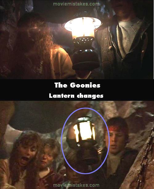 Continuity mistake: When Andy begins to lose it in the tunnel, Brand holds one lit lantern at the head of the line and Mouth holds another lit lantern at the back of the line (Mikey holds an unlit lantern). Next shot the lit lanterns have switched, just as they reach Chester Copperpot and Andy screams. Then in the next wideshot before it pans to the skeleton, the lantern Brand holds up switches yet again. (00:53:15)