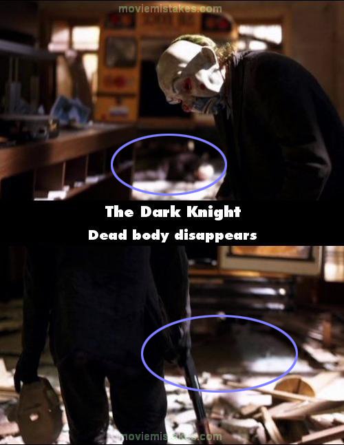 Continuity mistake: During the bank scene, the Joker shoots the bus driver and he falls dead in front of the bus. As the Joker approaches the Bank manager to put the gas can in his mouth, you can still see the body. But after he removes his mask and walks toward the bus, the driver's body is gone. (00:05:30)