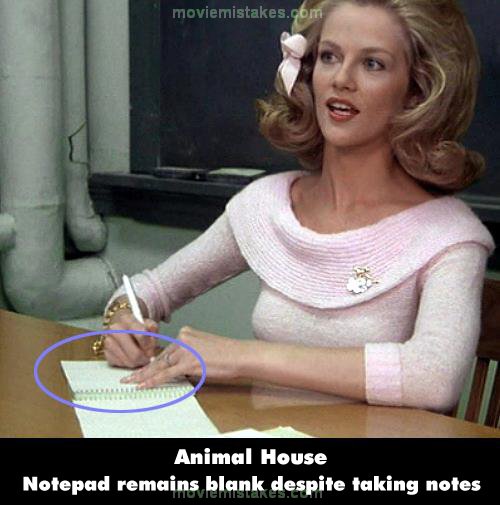 Revealing mistake: When Babs is writing down what is said during the fraternity's disciplinary hearing (court reporting), no ink is actually coming out of her pen as she writes on her notepad. In fact, the notepad remains blank even as she turns to a new page while still writing. (01:04:50 - 01:05:55)