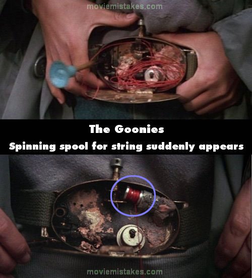 Continuity mistake: At the start, when Data practices with the blue suction dart, in the close-up as the dart flies out we can see the mechanisms inside Data's invention. When it cuts to a tighter close-up, suddenly there is a spinning spool welded inside, which was not in the previous shot, that is retracting the orange string. (00:03:50)