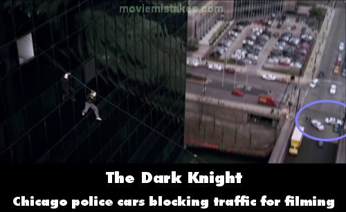 Revealing mistake: In the opening sequence, when the robbers are on the zip line, two Chicago Police squad cars (white cars with blue markings), not Gotham PD (blue with white markings) can be seen blocking off Van Buren Street for the filming. (00:01:05)