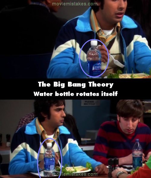 Continuity mistake: When Sheldon is questioning Raj and Howard in the cafeteria, the bottle of water is on Raj's tray faces the camera with the barcoded side. But in one closeup it rotates to show the logo-branded side.