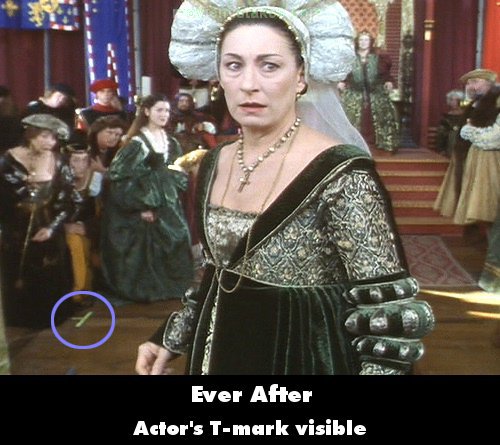 Visible crew/equipment: After the Baroness is stripped of her title, Danielle makes her entrance and everyone bows. When her stepmother has turned to face her, as everyone rises the actor's T-mark taped to the floor is visible to Jacqueline's right, behind the former Baroness. (Only visible on fullscreen DVD.) (01:52:40)