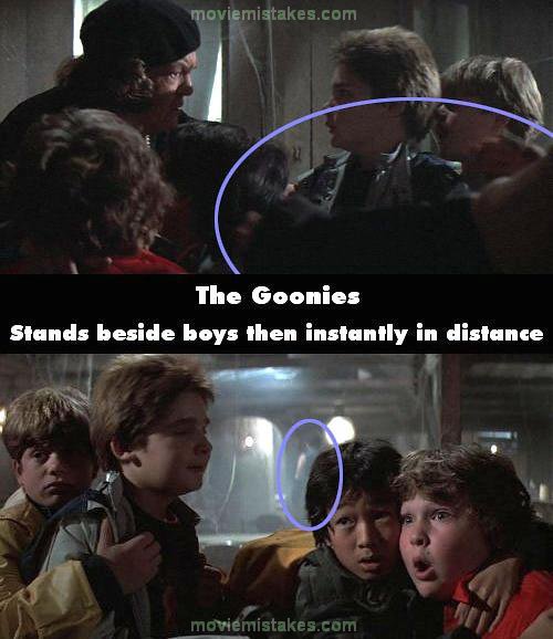 Continuity mistake: In the scene where Mikey, Data, Mouth and Chunk enter the restaurant, when Mama Fratelli asks, "What do ya want?" Jake Fratelli is behind them with his hand on their shoulders. When the angle changes Jake Fratelli is at the back of the restaurant walking away. (00:30:20)