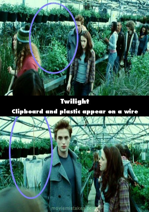 Visible crew/equipment: In the greenhouse on the school field trip, as Edward says he is sorry "for being rude all the time" to Bella, between the wide shot and the closeup a clear plastic sheet hanging from wire appears behind Edward, in the plants. (00:27:00)