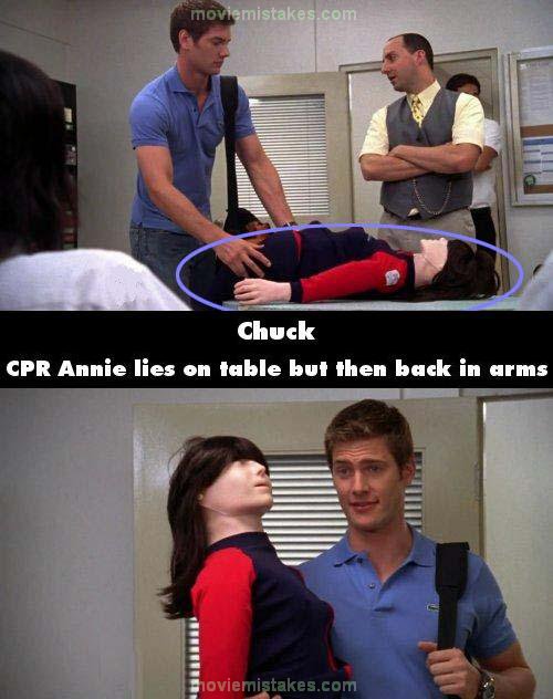 Continuity mistake: When Devon arrives to the CPR course for the Buy More employees he brings a CPR-doll and puts it down on the table. Yet, a second later it's right back in his arms in the same seemingly uncomfortable position as before.