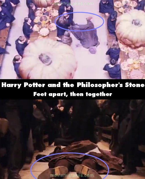 Continuity mistake: When Quirrel collapses in the great hall on Halloween, his feet are quite far apart. Camera cuts to everyone rushing for the door, and Quirrel's feet are practically touching. (01:05:30)