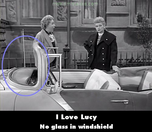 Revealing mistake: Look closely at the Ricardos' new Pontiac convertible. There is no glass within the windshield frame.