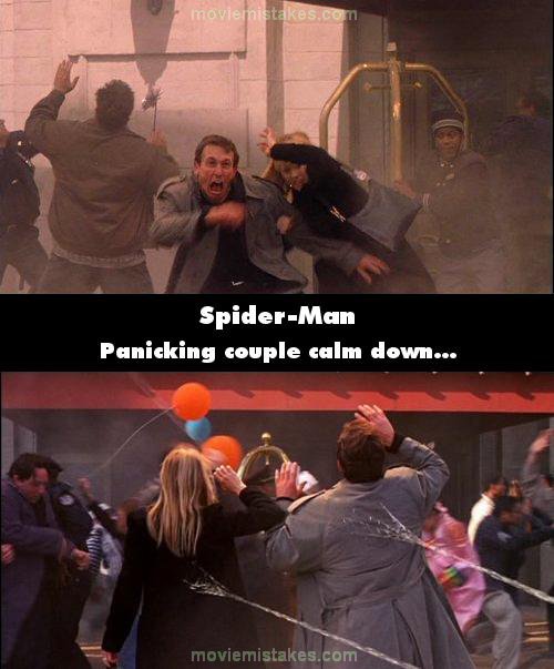 Continuity mistake: During the World Unity Festival, as the balcony first collapses, a blond woman and a man are running to get out of the wreckage. But in the next shot, the same couple just stand under the falling balcony looking up and Peter uses webbing to pull the standing-still couple to safety. (01:04:15)