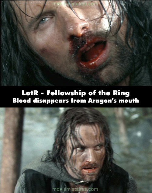 Continuity mistake: Aragorn's mouth is badly bloodied when he is headbutted by Lurtz, but the blood disappears almost immediately. (01:22:10)