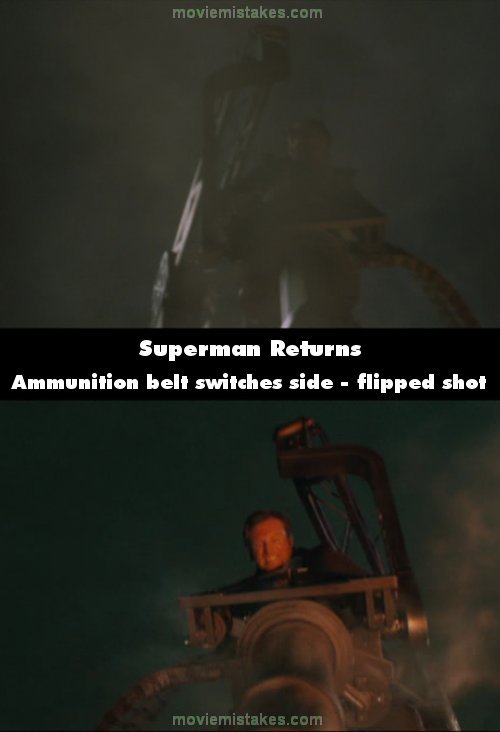 Continuity mistake: During the robbery, the machine gun's ammunition belt is on the weapon's left side. In one brief shot, it's on the right. This shot is flipped. (00:55:35)