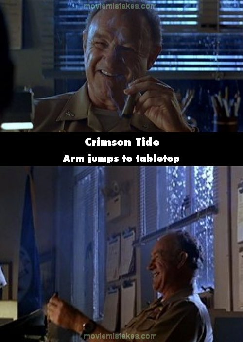 Continuity mistake: When Denzel Washington meets Gene Hackman for the first time, Hackman is holding a cigar in front of his mouth. In the next shot, his arm is suddenly down on the table, and he lifts the cigar to his mouth again. (00:06:30)